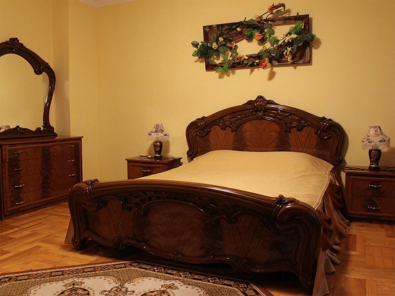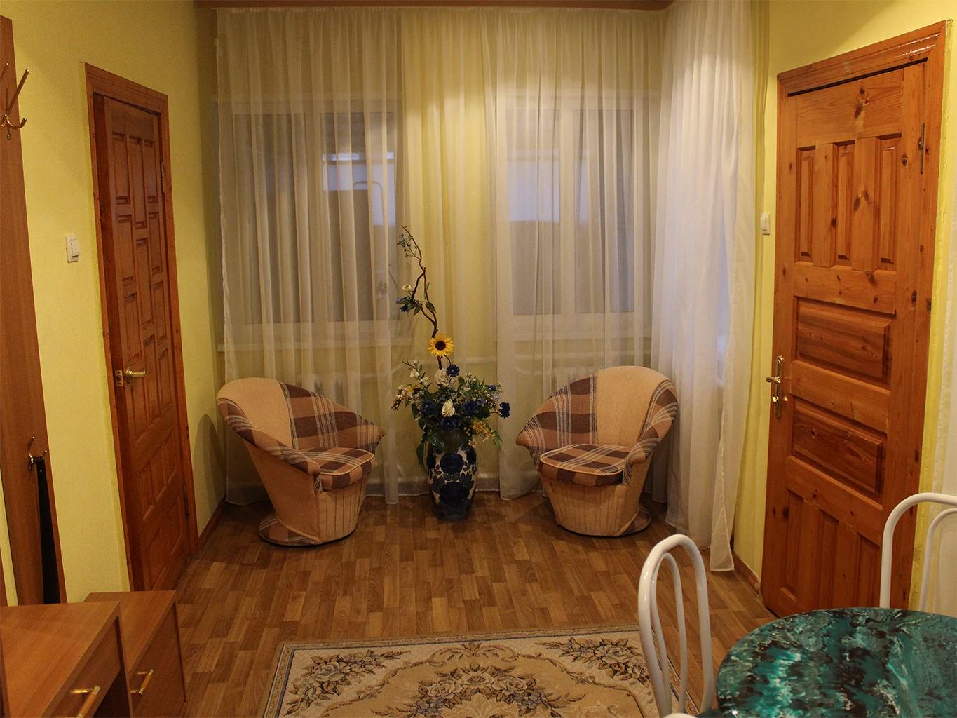 4 осн. места. 3 доп. места. Мебель: зеркало, кровати полутороспальные (2), кровать двуспальная, кухонная мебель, набор мягкой мебели, прикроватные тумбочки, стол, стулья, шкаф. Оборудование: кондиционер, набор посуды, плита электрическая, телевизор, утюг, холодильник, электрочайник. Санузел: с душем, туалетные принадлежности, фен. Сервис: Wi-Fi бесплатно, смена полотенец, смена постельного белья, уборка номера.